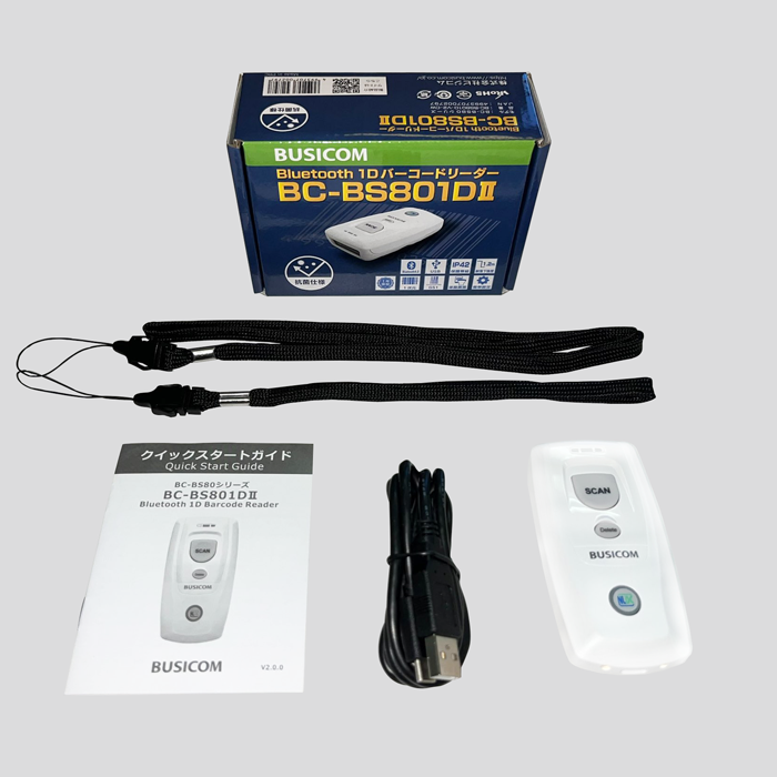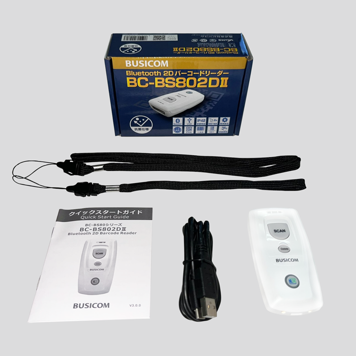 同梱品 | バーコードリーダー、ハンドストラップ、 ネックストラップ、 USBケーブル、クイックスタートガイド |