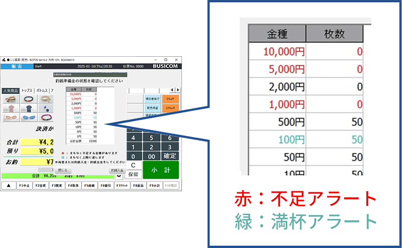 POSレジソフト「BCPOS」は釣銭金の不足や満杯が近づくとレジ画面にアラートが出るので、トラブルを未然に防ぎます。