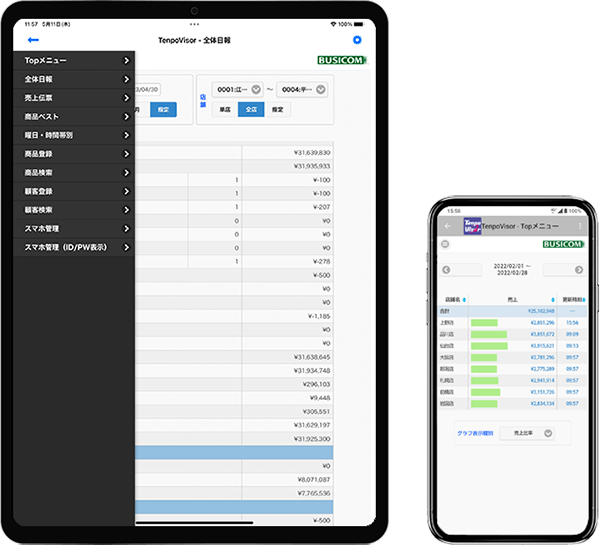 Tenpo Visorはクラウド本部管理システムです。ビジコムのPOS情報を一元管理でき、多店舗管理もチェーン店管理もひと目で見える化。
