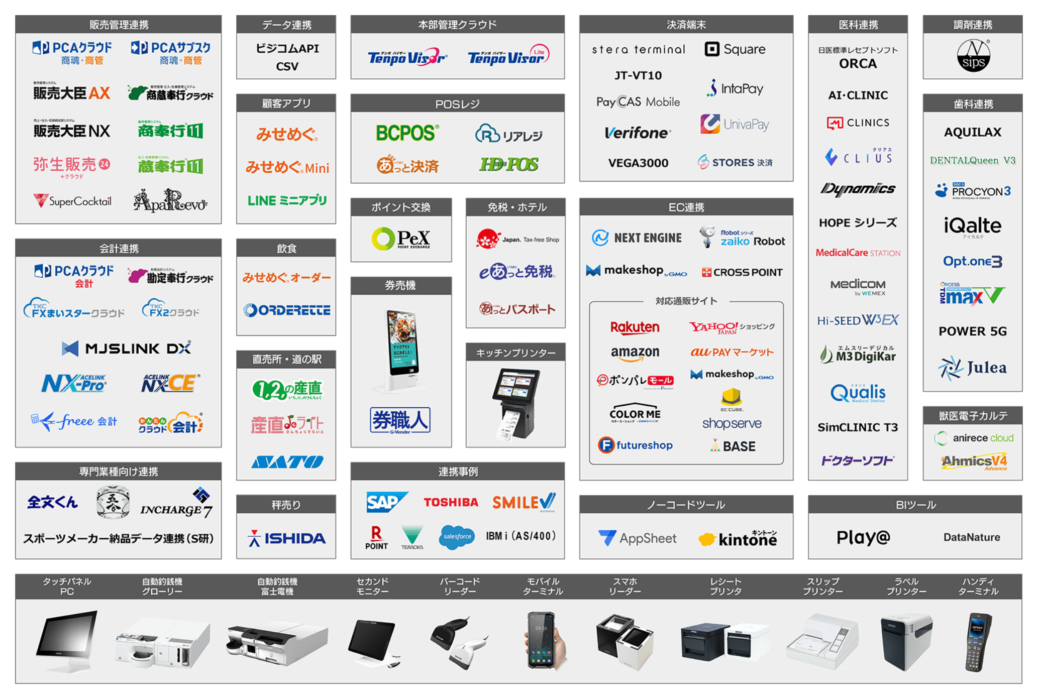 「TenpoVisor」についてBCPOSは自社ソリューションだけでなく、他社システムとも幅広く連携しています。システム接続料がかかるメーカーが多いなか、手数料・サブスク費用が無料でご利用いただけます。