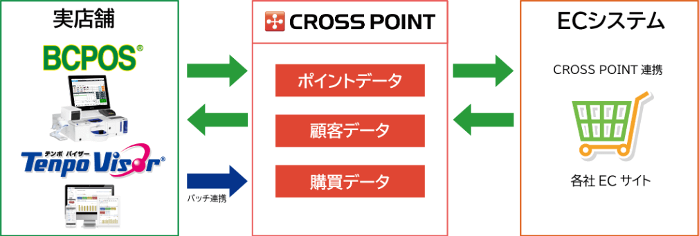 ネットショップと実店舗のポイント連動を実現するポイント管理ASPサービス「CROSS POINT」と「BCPOS」の連携でECサイトで登録された顧客情報がPOSレジと連動し、実店舗での顧客情報・ポイント情報の共有が可能になります。BCPOS連携費用 月額2,000円/店。