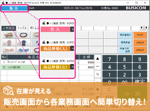 仕入も店舗間での移動処理も販売画面から簡単操作でできます。