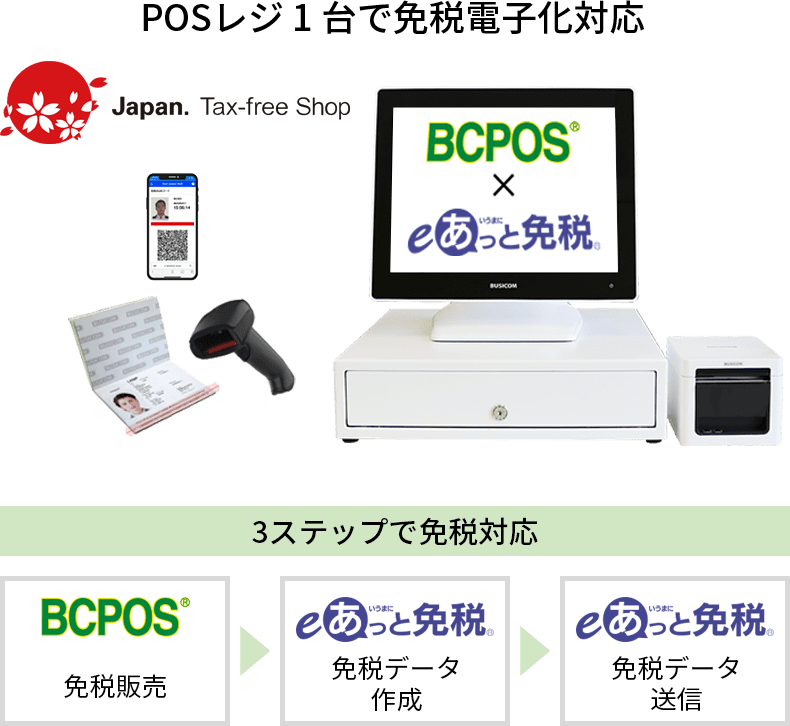 BCPOSには免税販売機能が標準搭載。免税電子化システム「eあっと免税」との連動で免税電子化にPOSレジ1台だけで対応できます。
