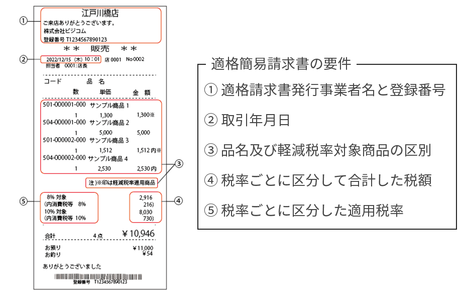 レシートは適格簡易請求書(簡易インボイス)と呼ばれ、BCPOSで発行したレシートには適格簡易請求書の要件を満たした内容を印字します。さらに、登録番号のバーコードも印字できるので、レシート受領者が登録番号を照合する際の読み取りなどにご利用いただけます。