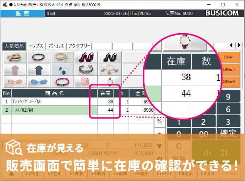 インボイス対応について販売画面で商品の在庫数や稼働数がリアルタイムで見えるので、接客時などでも在庫を確認できます。