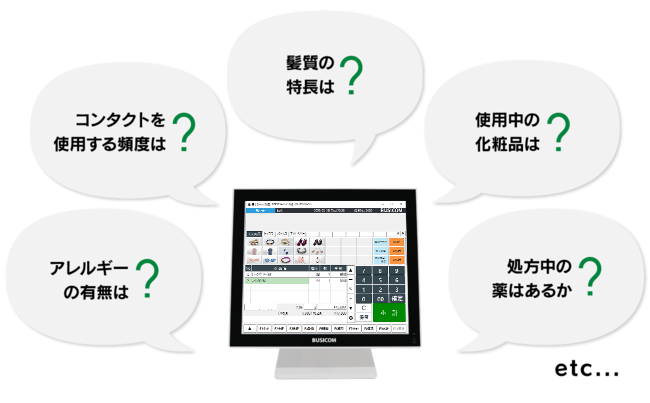 カルテにはお店に合わせた質問内容が設定できます。簡易質問のプルダウン式と、テキスト入力ができる入力式の両方が利用できます。アンケートなどお客様の回答をPOSに登録することで、購入履歴だけでなくカルテでの詳細情報もPOSレジで確認することができます。