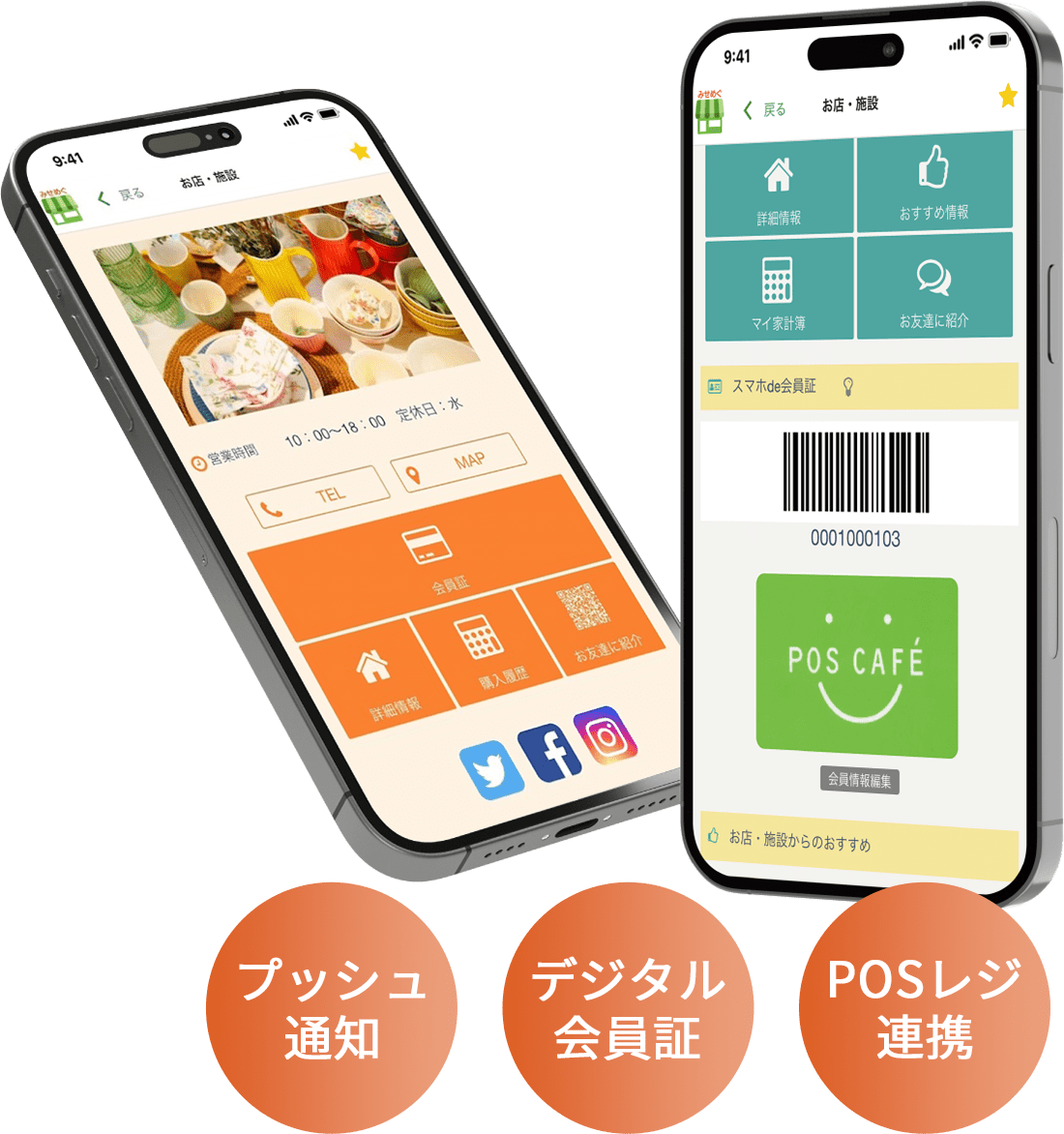 お客様のスマホデジタル会員証となります。また、プッシュ通知でお店から案内をお客様に直接配信したり、お店ページでおすすめ情報を画像付きでPRできます。