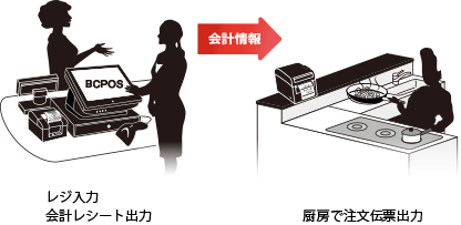 お客様用の「レシート」と、レジと離れた厨房に「注文伝票」として同時に出力します。