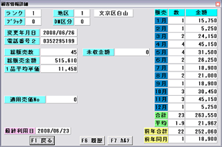 顧客を呼び出した状態で、レジ画面から顧客情報詳細を呼びだし、お客さまの過去12ヶ月販売金額や平均単価等の動向を表示することができるので、一定期間来店していないお客様へアプローチする等、優良顧客を逃しません。