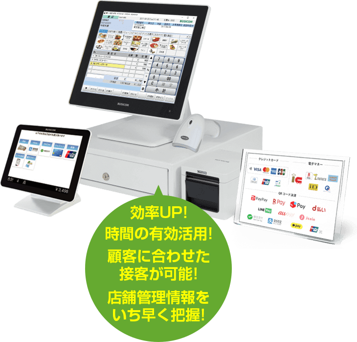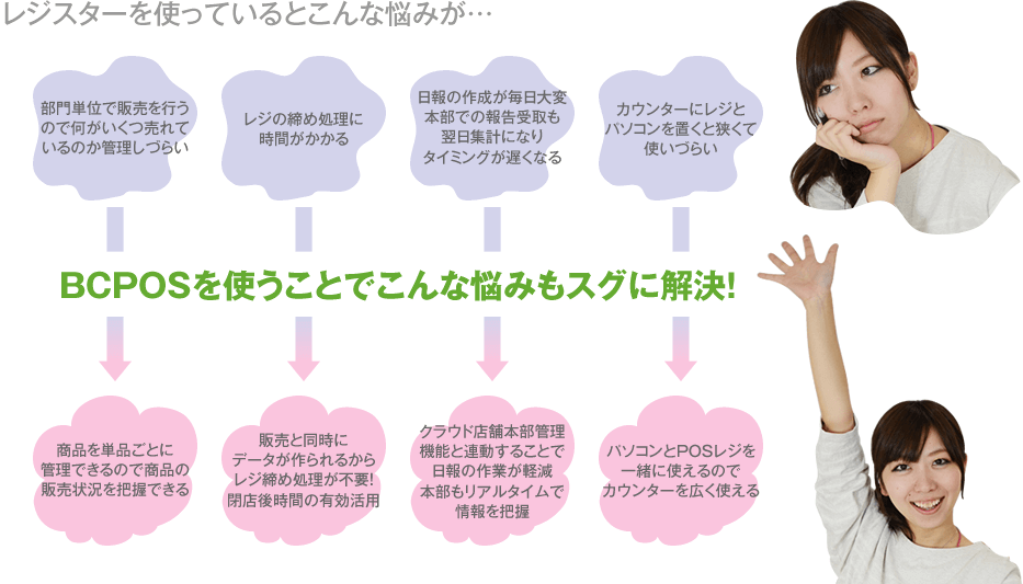 BCPOSは基本システムだけで、レジ機能・商品管理・在庫管理・顧客管理・ポイント発行の機能があるから、お店に必要な機能が使え、必要な情報が集まります。