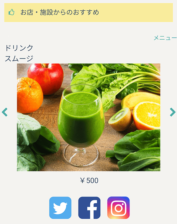 お店ページでは、おすすめ情報として、商品・メニュー・チラシ・クーポンなどの写真をスライド形式で無制限に掲載できます。