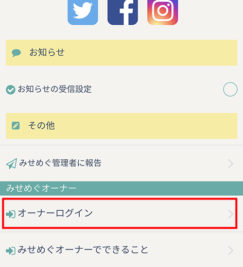 ※「オーナーログイン」はアプリHOMEのサイドメニューにもあります。