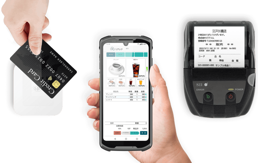 持ち運んでどこでも使えるスマホ型POSレジ「リアレジモバイル」は、