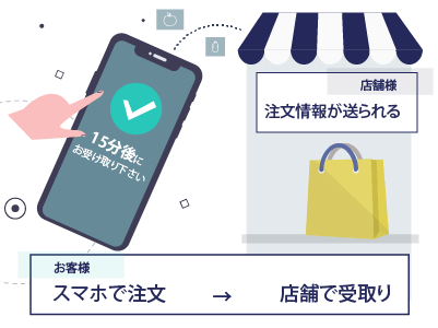 お客様ご自身のスマホで注文、データがキッチンに送られるので、お客様受け取りのタイミングに合わせて製造・梱包等を行えます。受け取りのタイミングでお客様にはプッシュ通知でお知らせ。