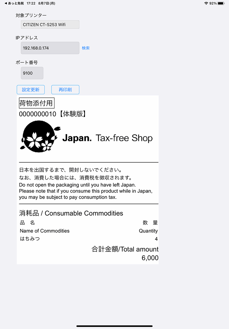 一般品と消耗品の免税合計金額を自動的に算出して免税販売ができます。
