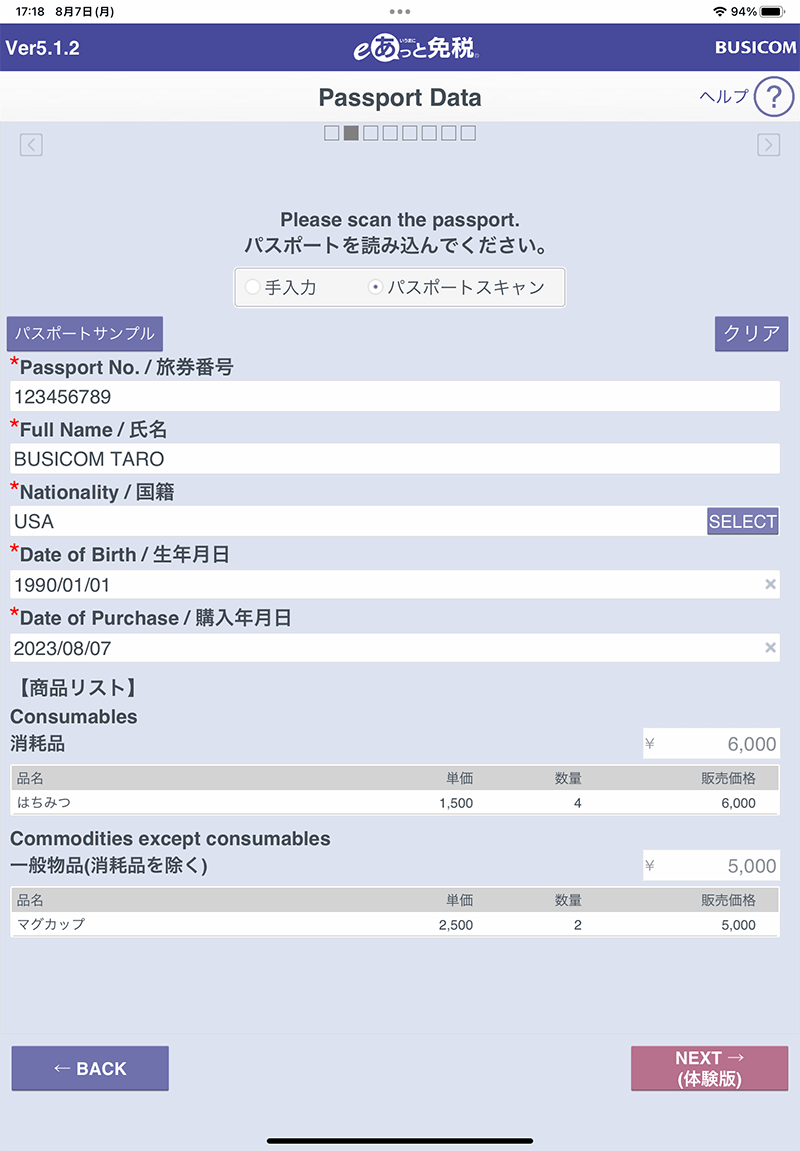 eあっと免税でデータを取り込み、パスポート情報や在留資格など免税手続きに必要な情報を付加して電子データを作成・送信します。