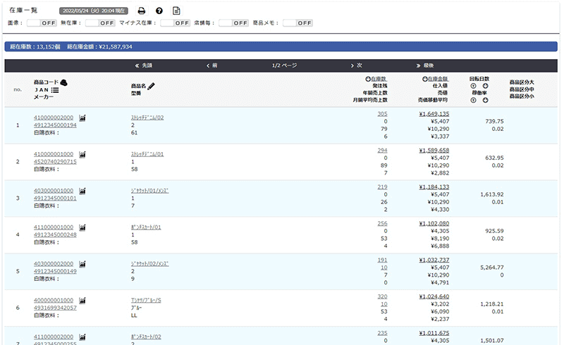 店舗・期間指定・各種絞込み項目の範囲内に販売・仕入された稼動を閲覧することができます。