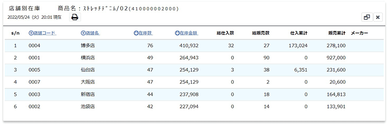 特定の商品を指定し、店舗ごとの在庫を閲覧できます。