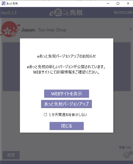 Windows版のeあっと免税でTOP画面を表示した際に、バージョンアップのお知らせを表示するようにしました。