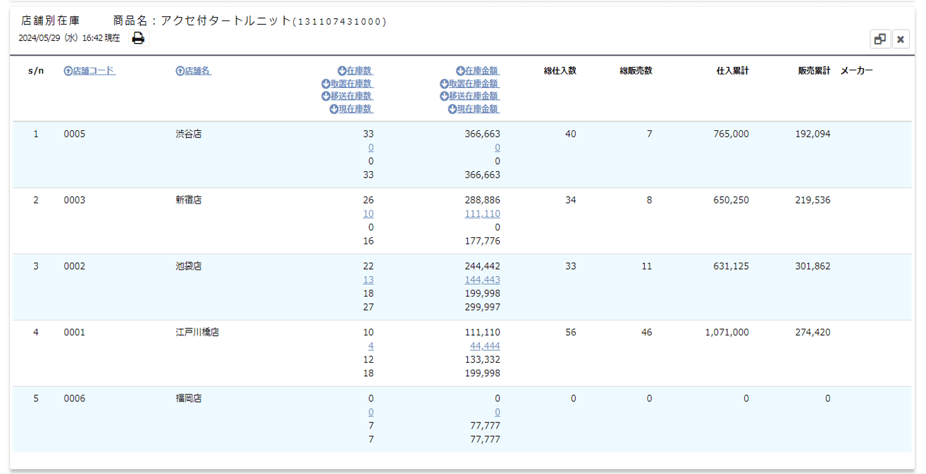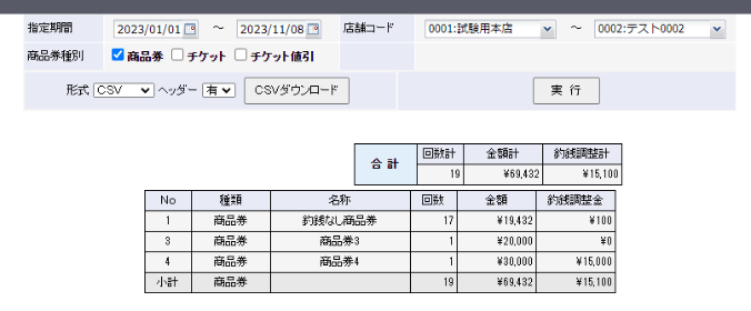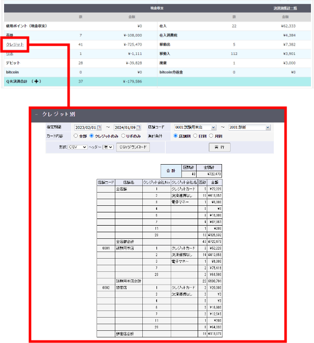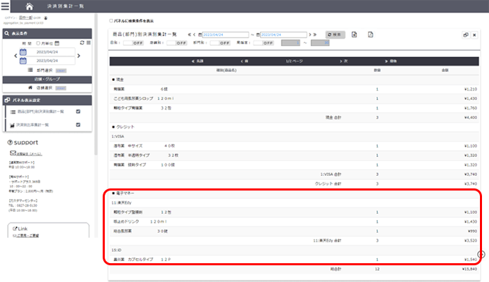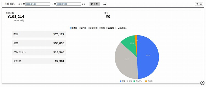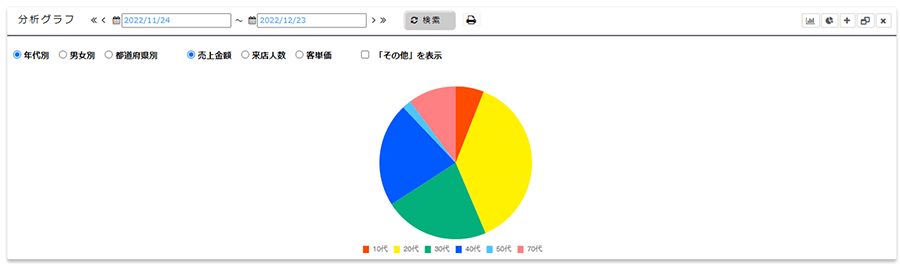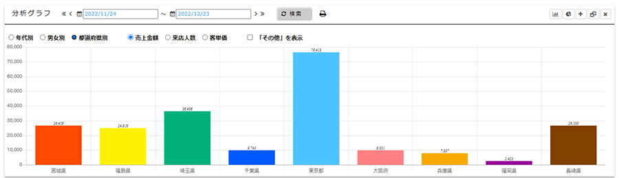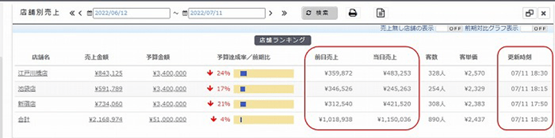 曜日・時間別での全店舗・各店舗の売上をグラフや表で視覚的にご確認いただけます。