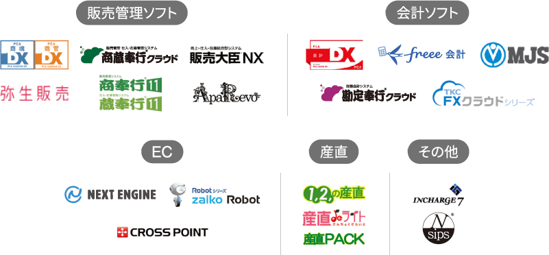 APIで販売管理ソフトや会計ソフトと連携して業務効率化できます。基幹システムや産直システム、ECサイトとの在庫やポイント連携、NSIPS®でレセコン調剤会計データとの連携、医療機関向けレセプトコンピュータとのバーコード連携など業種・業態に合わせて様々なシステムと連携します。