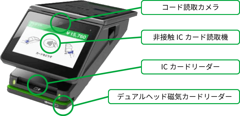 1台の端末でクレジットカード・電子マネー・QRコードなどさまざまなキャッシュレス決済手段に対応したオールインワン決済端末機。お客様向けとスタッフ様向けのデュアルタッチスクリーンを採用。決済アプリケーションによる決済処理終了時には端末に内蔵されているプリンターよりレシートが印字されます。お客様・スタッフ側画面の英語表記への切替が可能。これにより外国人観光客への対応に強さを発揮します。